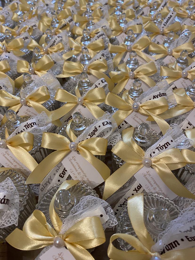 Μπομπονιέρα γάμου φοντανιέρα δεμένη με χρυσή κορδέλα και κορδέλα με ευχές.