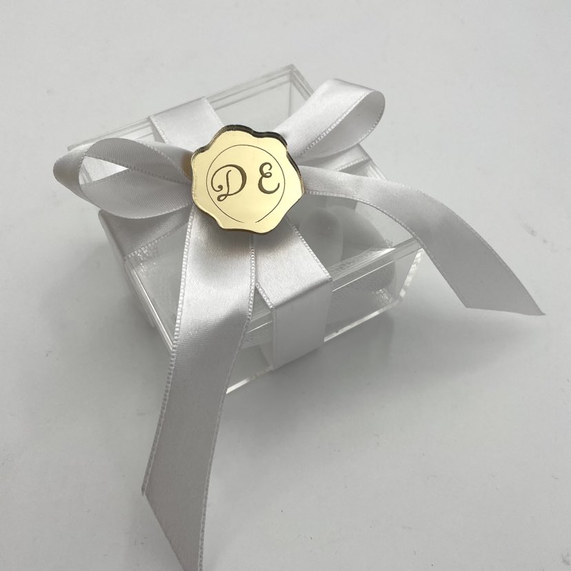 Μπομπονιέρα plexiglass κουτάκι δεμένο με σατέν κορδέλα και plexiglass κυκλικό στοιχείο με μονογράμματα.