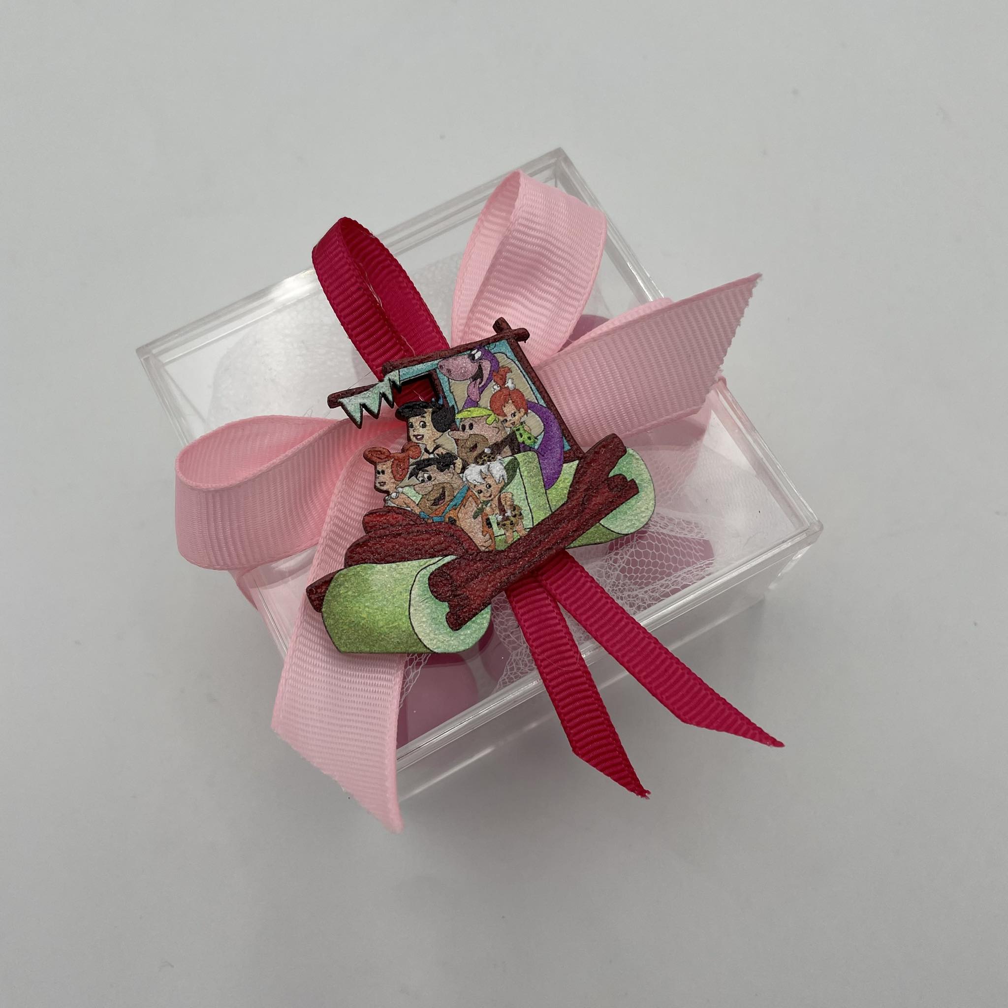 Μπομπονιέρα βάπτισης plexiglass κουτί στολισμένο με κορδέλες και ξύλινο στοιχείο Flingstones.