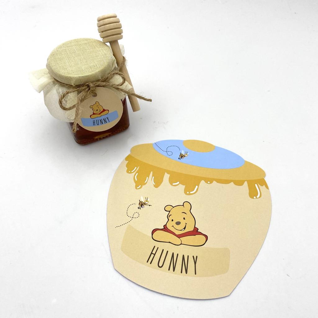 Μπομπονιέρα βάπτισης γυάλινο βαζάκι με μέλι, διακοσμημένο με γάζα και τον γλυκό Γουίνι.