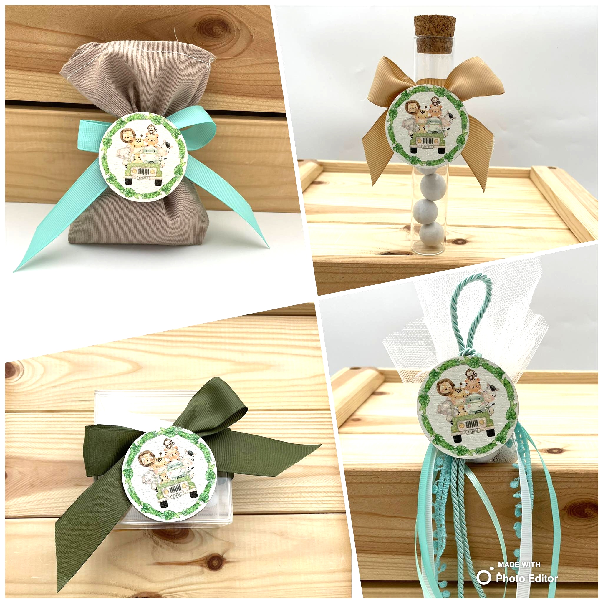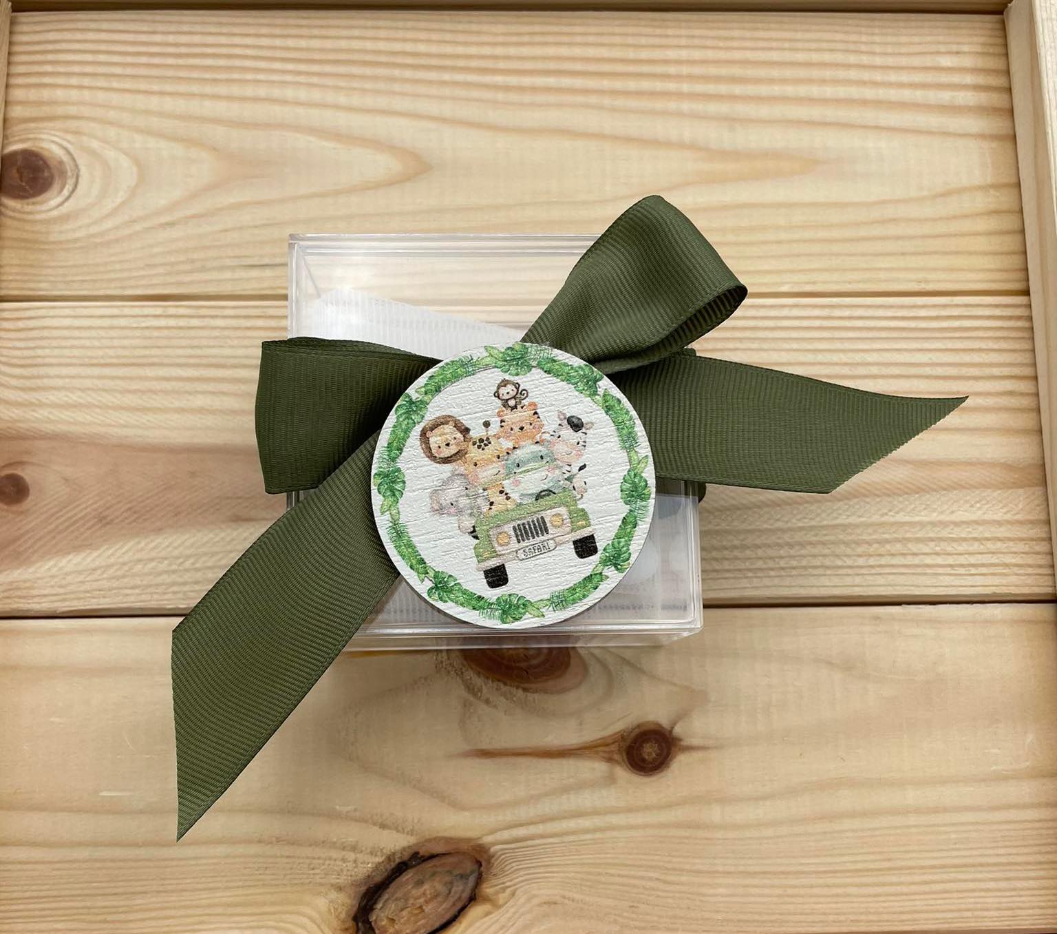 Μπομπονιέρα βάπτισης με ξύλινο στοιχείο Ζωάκια του δάσους.